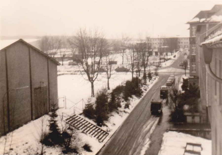 Links die Sporthalle und im Hintergrund quer das Stabsgebäude